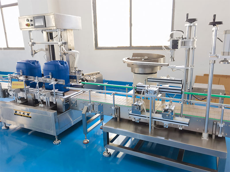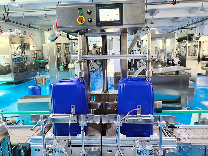 全自動稱重式灌裝機械的核心工作方式,主要是以重量定體積,以此不受物料密度、溫度、粘度變化影響,以此確保灌裝精度的統一性,工作人員在18公斤稱重灌裝機的顯示屏幕內設定好灌裝參數規格,輸送帶會將空的容器桶送至灌裝工位,氣動擋桶機構于定位裝置會在協同的作用下將其卡定在下料處,稱重傳感裝置將實時檢測空桶內的重量信息,并將灌裝的數據反饋至PLC控制系統內,自動進行記錄并扣除桶重,灌裝閥在開啟的那一刻,按雙速灌裝模式進行物料輸送,當達到慢灌閾值時,PLC控制灌裝閥切換流量,當重量達到18公斤設定值時,立即關閉灌裝閥,完成灌裝。